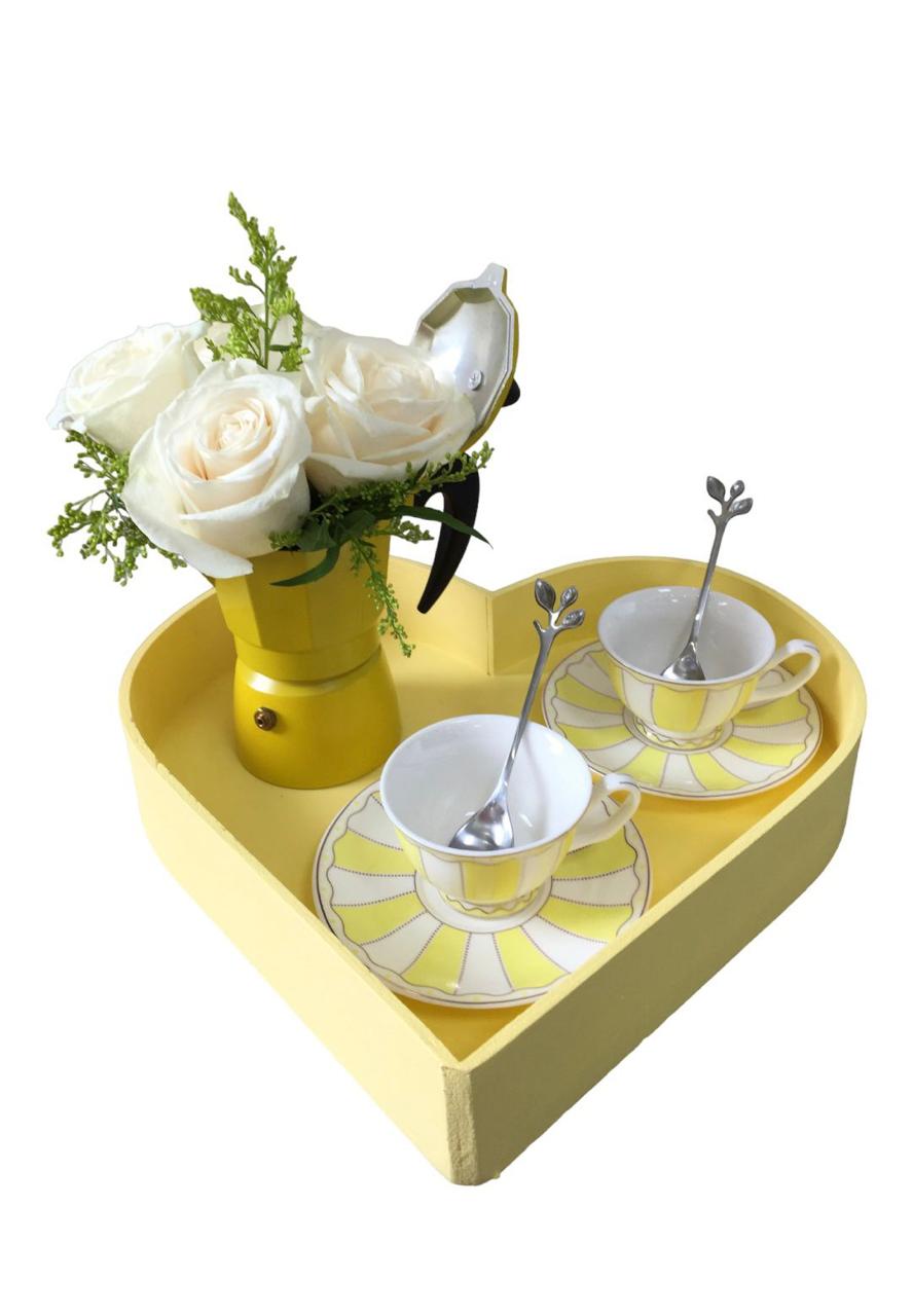 una bandeja en forma de corazón 12" + una greca de dos tazas + dos tazas para café y dos cucharitas + 4 flores naturales importadas